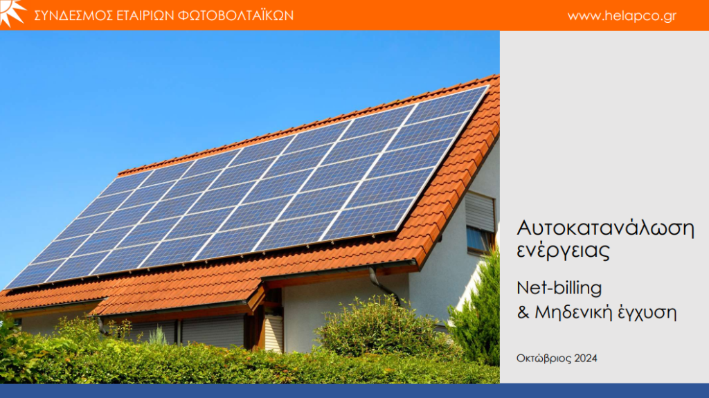 Ο Σύνδεσμος Εταιρειών Φωτοβολταϊκών εξέδωσε την παρακάτω εξαιρετική και αναλυτική παρουσίαση για το πως διαμορφώνεται πλέον το τοπίο στην αυτοκατανάλωση ενέργειας, μετά την εισαγωγή του ταυτοχρονισμένου ενεργειακού συμψηφισμού (Net Billing) και του εικονικού του ταυτοχρονισμένου ενεργειακού συμψηφισμού ( Virtual Net Billing) .